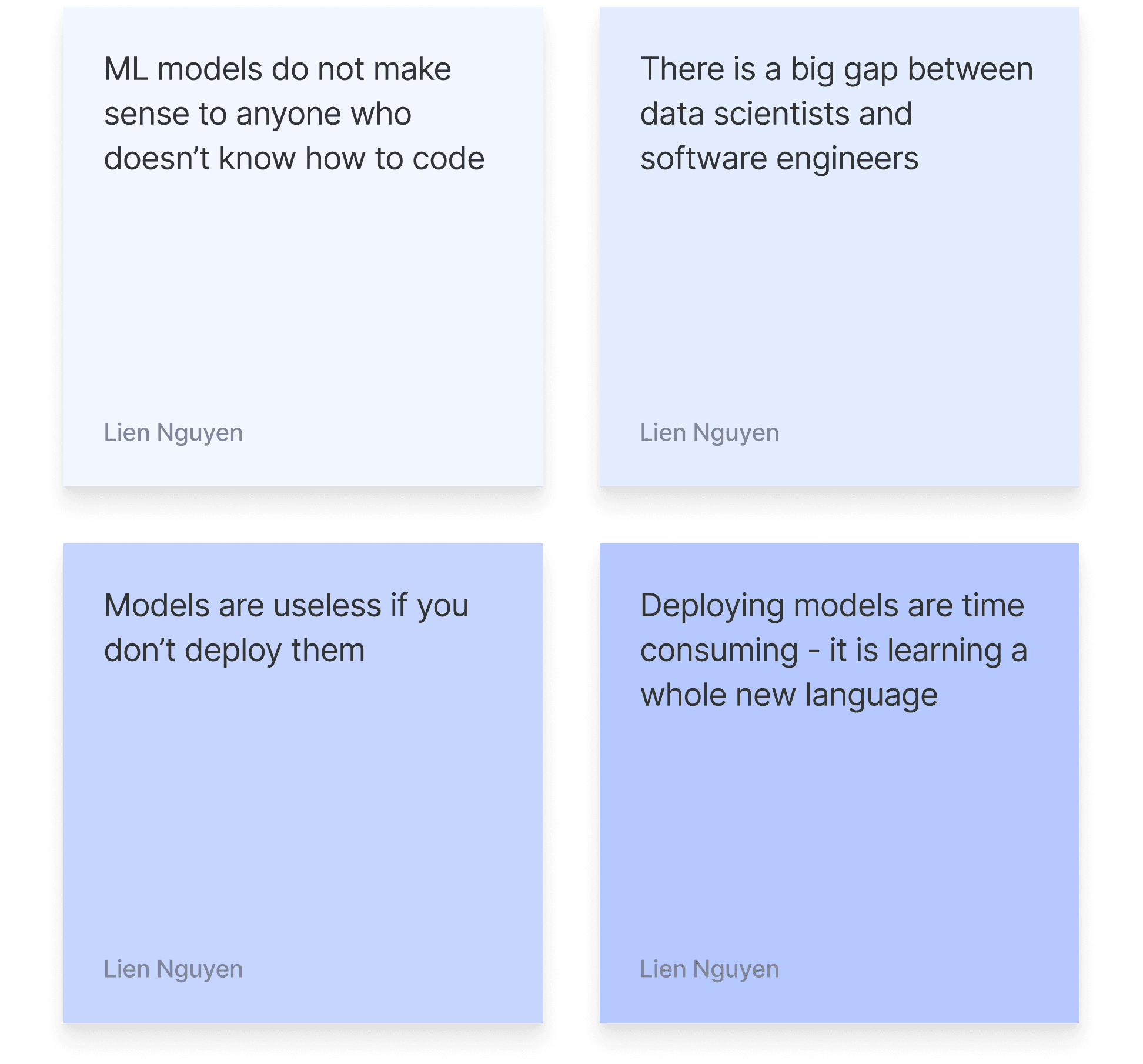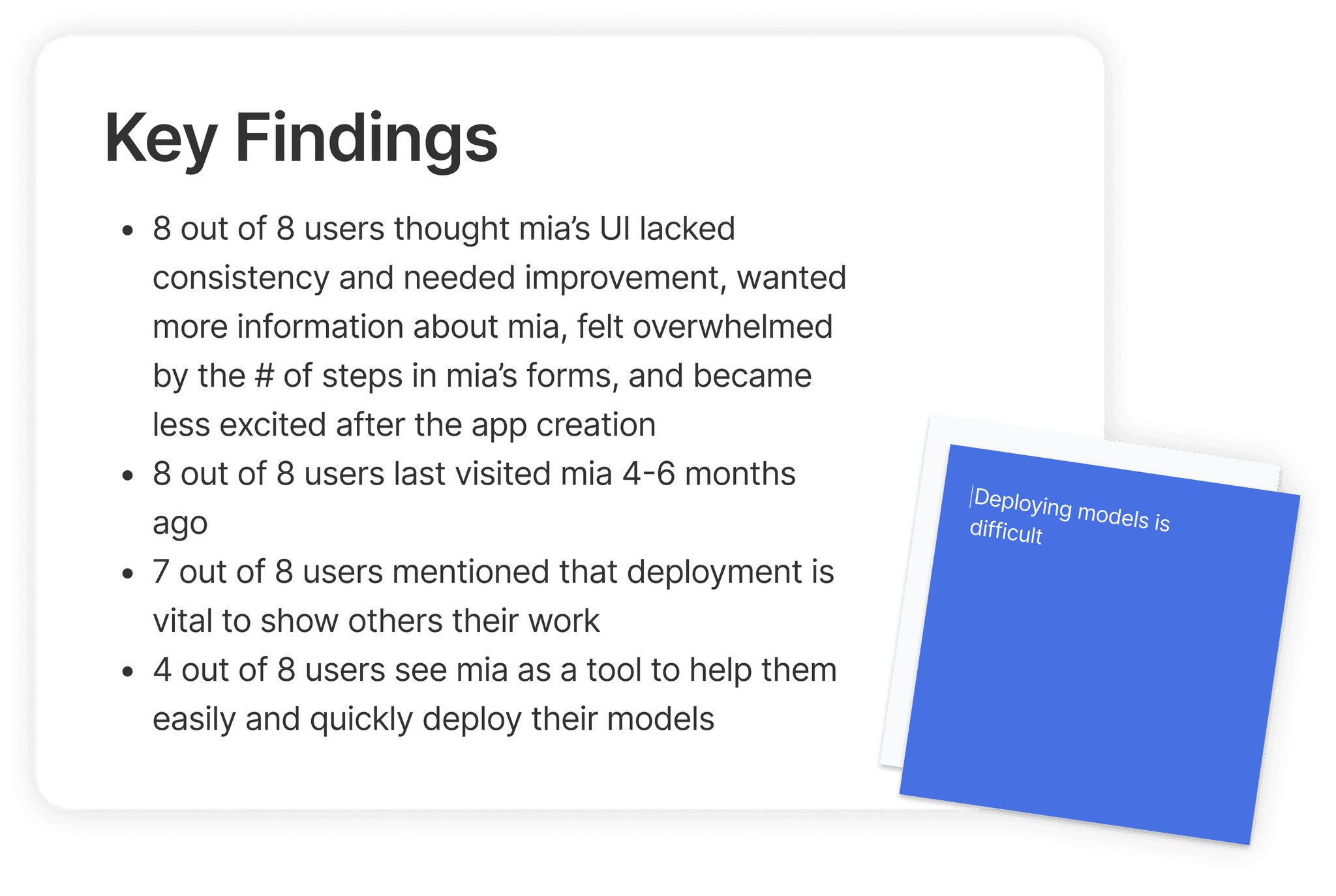 We carried out two rounds of interviews with 30 data scientists, the first one focusing on the usability of the website through contextual inquiry and the second one learning about mia’s users thoughts, frustrations, and motivations.