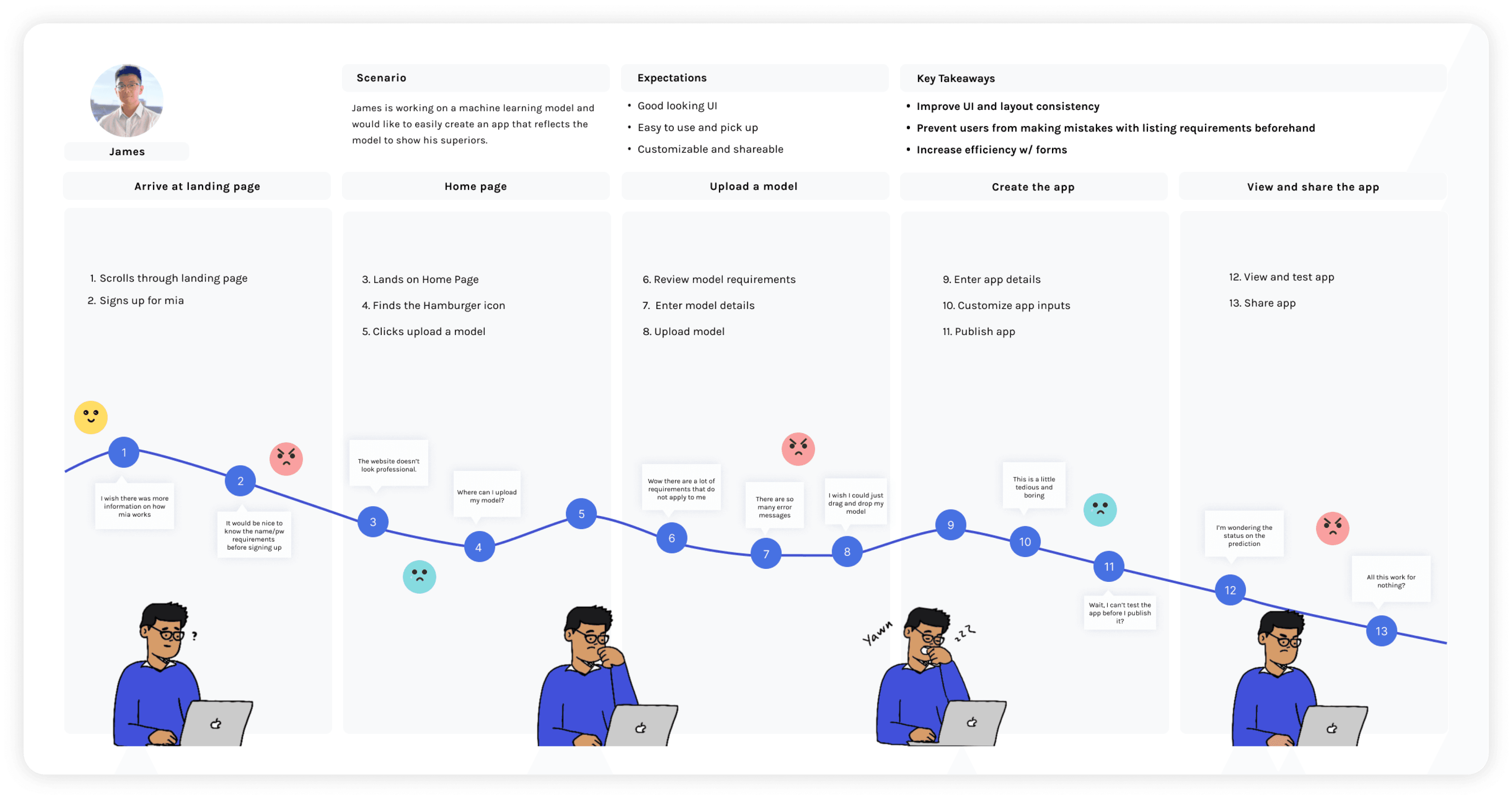 We created a persona, James the data scientist, and his journey with mia’s current website from our interviews’ key findings.